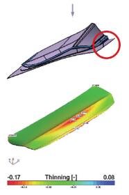 ⑵检查该件拉延筋的分布,该件前后侧易起皱位置均有两条拉延筋布置,且CAE模拟(图4)F向已有开裂风险,与现场状态基本一致,在控制起皱的前提下极容易出现开裂。