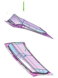 结合以上起皱理论,针对V205后备厢外板上段起皱(图1)深入分析原因。通过拉深件冲压方向及CAE开裂风险报告(图2)分析可以看出,主腰线附近存在开裂风险,因此工艺规划时工艺补充形状简单,高度很低,虽有效降低了制件开裂的风险,但起皱的风险加大,起皱后的调整难度加大,而且该制件模具已经投产,且生产频繁,如果从更改工艺补充和更改模具结构上想办法不符合生产实际,因此从以下方面分析和制定对策: