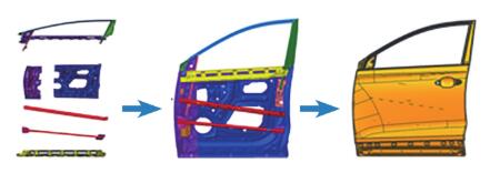 ⑴门内板前部、门内板后部、上段加强板分离式设计,如图2所示。这种组合和焊接方式材料利用率高、材料制造成本低,存在的弊端就是冲压件的冲次费用高、单件/焊接尺寸一致性管控异常风险大、焊接成本高,奇瑞捷途X90车型就采用该种焊接组合方式。