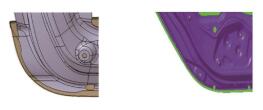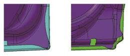 门外板翻边R角(图7)等关键区域,料边不可过长,通常在5mm左右,过长会导致翻边开裂或翻边起皱,折角受力面会影响门总成平度尺寸。包边转角处或造型急剧变化处的料边建议2~3mm预弯不包边,如图8所示。包边转角圆弧跨度大,外板翻边长度建议5mm左右,料边过长会导致圆弧处起皱,如图9所示。