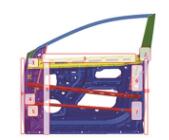 ⑶门内板前后部激光拼焊、上段加强板分离式设计,如图4所示。这种组合方式材料利用率高、利于单件/焊接尺寸一致性管控,存在的弊端是激光拼焊稳定性差、模具精度/压机精度要求高,目前奇瑞捷途X70车型采用的是这种组合方式。
