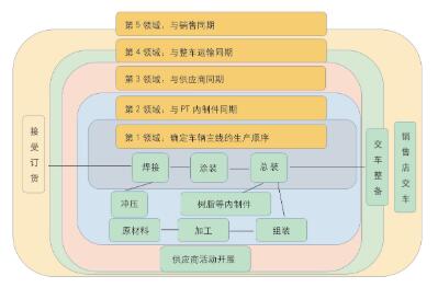 依照订单到交车的流程,我们将同期生产设定为五个领域,展开相应活动,如图1 所示。