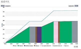 1)可以选取任意时间点,查看在此时间点时已经完成的冲次或生产数量,如图3 所示,绿色为正常生产,其他颜色代表已定义的不同停机原因。