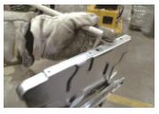 机器人底盘自动上挂系统由2台ABB6700组成,每台机器人每次负责2个底盘的自动上挂。当机器人接到启动信号时,机器人从零件传输线抓取零件至视觉智能定位系统进行拍照。拍照完毕后机器人接收到视觉软件系统计算出来的挂具挂点位置坐标(图8),机器人按照坐标进行移动并完成零件上挂(图9)。