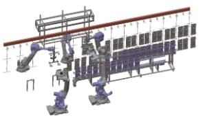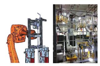 挂具自动抓取与定位系统将挂具状态由动态变为静态,且挂具最终被放置于定位架中。为实现自动上料,需要使用机器人夹取钣金件并将其悬挂在位于定位架中的挂具上。