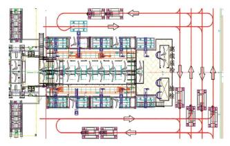 图2 线尾自动装箱系统及笼车自动搬运系统布局参考