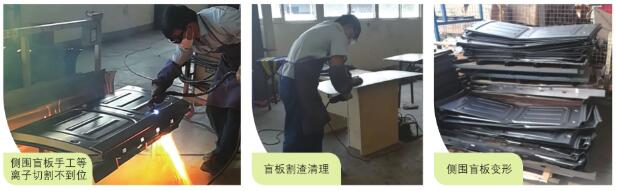 ⑴报废率高。盲板报废率高主要集中在侧围外板盲板使用手工等离子切割,造成切割线不齐、切割后变形、人工操作不到位(图1)等问题。数控等离子切割机在切割下料时会产生金属烟尘、颗粒、弧光、高频辐射等污染,操作工作业时视线不清晰、环境噪声大,人员频繁流动造成员工技能不足等,造成盲板切割质量不达标,切割后变形等问题,综合数据核算其报废率高达20%。