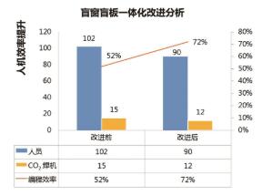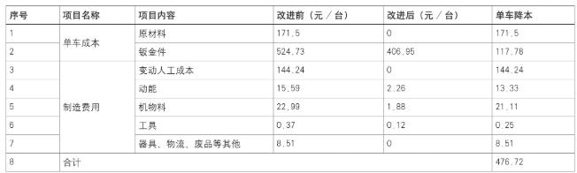 对主焊线改造后查看单车生产状态及整改后的效果(图7),主焊线通过性验收,生产线验收达标,可进行量产。根据改造后情况进行成本及效率核算,在整车使用成本方面核算见表1。整车生产效率方面,使用的人员减少12人、二保焊机减少3台,编程效率提升20%,如图8所示。