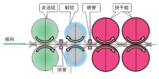 清洗机板料的清洁度与喷管喷淋范围W 相关,喷管设置在刷辊前后,上下各1 对,板料在刷辊前后都进行冲洗去除异物,从而保证板料清洁度。如图2所示。