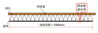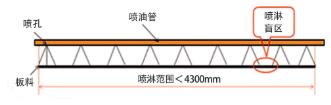 假设板料尺寸:长4300mm×宽2000mm ,喷淋范围W 必须大于4300mm。满足喷淋范围和不满足喷淋范围如图3、图4 所示。