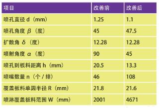 喷淋范围W 与表1 中参数相关,通过优化参数,主要优化喷嘴数量,由46 个提升至108 个,喷射角度由90°修改为45°,改善后满足喷淋范围。通过喷淋范围改善,板料清洁度由70%提高到100%,平均麻点率由5%降低到3%。