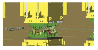 3)自动化要求。主要是检测当前产品设计是否满足自动化设备要求,是否影响生产节拍,包括模具摆放方向、零件冲压方向等是否造成机械手和模具之间的干涉等。为了检测此类干涉问题,开发冲压自动化运动仿真系统(图3),在模具制造之前评估自动化设备和模具碰撞风险并实现工具离线设计功能。