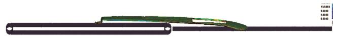 4)线末要求。线末主要是收料区,线末设备需要满足零件旋转、分张要求以及避免产生零件重力变形。零件重力变形是指冲压线末零件由机械手抓取、放到传送带然后再到收料台的整个过程中由零件自身重力引起的变形。外板零件由于自身刚性较差易出现此类问题,因此开发全过程重力变形模拟系统(图4),成功识别出若干零件的重力变形问题。