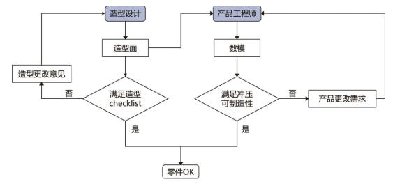 冲压工艺SE的工作流程如图7所示,造型释放造型面给相关功能模块进行造型评估,产品工程师根据造型面释放数模。冲压造型专家进行造型评估,并将结果反馈给造型工程师;SE工程师根据数模进行制造性评估,若存在可制造性问题则输出产品更改需求给产品工程师。另外,还有针对工程和造型问题的上升机制,确保问题得到及时的解决和反馈。