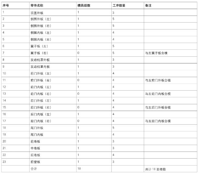 《整车厂冲压车间的规划设计研究》(上)见《锻造与冲压》2019年第18期冲压车间工艺规划实例设计输入⑴生产纲领及工作班制。年产24万台(套)冲压件,车间采用双班工作制,全年工作日为250天,每班工作8小时。⑵自制件。该项目冲压车间主要负责白车身的大型覆盖件、内板件的生产任务,初步拟定的自制件清单详见表2,根据表2可知,本项目规划共计18个装模数。