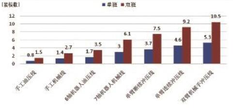 单条线体可承担的装模数测算公式为:可承担装模数=全年冲次数/生产纲领。单条线体单双班产能对比如图5所示。