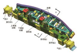 ⑶上、下模驱动腿铸铁件改为铸钢件,并优化结构设计增加强度,斜导板受力处增加安装螺钉,同时增加防侧导向装置,如图11所示。此结构可以有效防止气缸失效时因强度不足再次造成相关部件损坏。