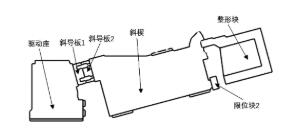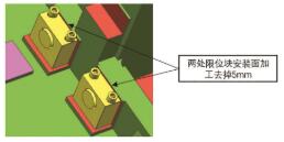 ⑵将驱动座限位块安装面(靠近气缸1位置)加工去掉5mm,如图9所示,保证在气缸正常工作,驱动座回程时上、下模驱动腿与斜导板之间留有5mm间隙,如图10所示。仅当气缸失效时上、下模斜导板进行接触,使驱动座强制回程,避免斜楔无法回退影响制件取出。