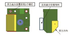本文所述模具驱动腿设计强度较差,螺钉位置不合理并且无防侧导向装置,如图7所示,这也是导致挡墙断裂的原因之一。