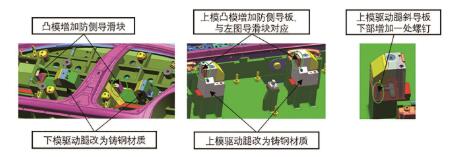 其他原因如限位块间隙过紧、导板导滑位置进入杂质、导板间隙过紧、气缸失效、驱动腿安装螺钉松动等,也可导致同样问题出现。某项目有一套模具与本文所述结构完全相同,由于限位块2间隙过紧,导致限位块挡墙与上模驱动腿挡墙长期受力过大而全部断裂。