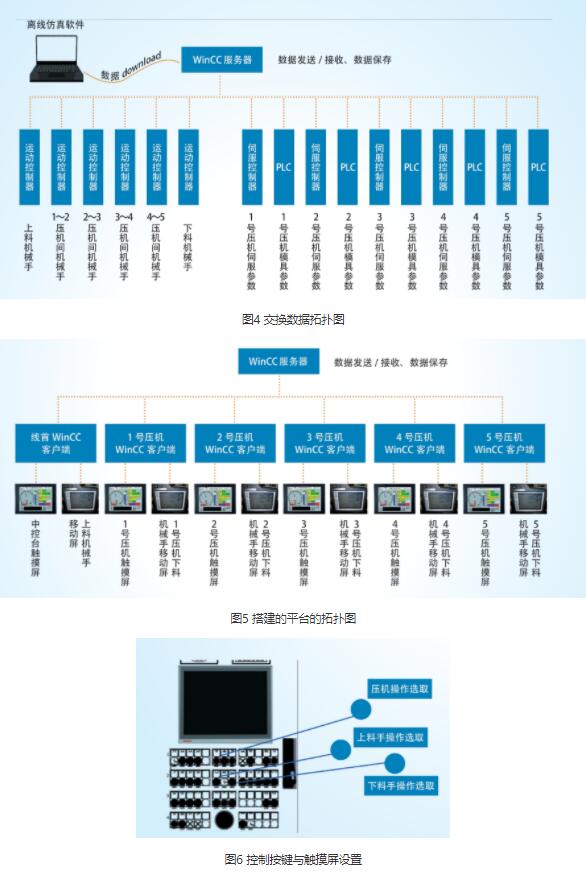 宝沃工厂的高速伺服冲压生产线由5 台伺服压力机和6 套传输机械手组成,其中包含了大量的运行数据和生产数据,其中主要包含:⑴每台伺服压力机曲线编程参数,每台压力机滑块运动包含9 个曲线点设置(包含位置、速度等信息);⑵每台机械手运动轨迹曲线编程设定,每个循环运行轨迹包含15 个曲线设置点,每个点包含8 个轴的角度、位置设定其他相关参数;⑶每台压力机与模具的相关参数设定,包含封闭高度、夹紧器、自动化气源、平衡杠压力等设备参数;基于WinCC 搭建的服务器平台能更好的实现海量数据的存储与交换,交换数据拓扑图如图4 所示。