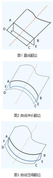 在曲线翻边成形过程中,板料主要分成三个区域:非变形区(压料区域)、圆角、主要变形区(翻边成形面)。图1 为直线翻边。图2 翻边成形时压料区域只是受到向下(冲压方向)的压力,因此材料不发生塑性变形;主要变形区在翻边镶块的作用下,材料内部会处于双向受拉或双向受压的应力状态。翻边成形时,变形区域CDAB 翻边后沿着AB 向下反转最终变成EFAB,变形区域外缘CD 变成弧线EF,图3 中DC会变长,反之会变短。