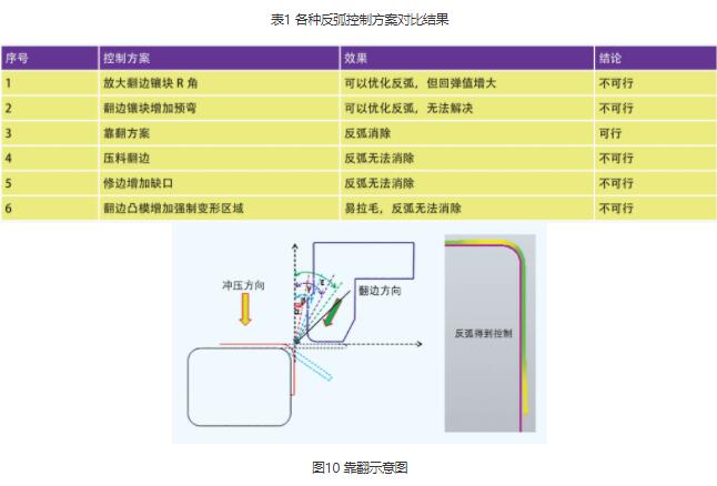 翻边反弧是冲压件比较常见的冲压件缺陷,也是比较难以解决的。目前,各模具厂都采用几种常见的控制方案,如翻边镶块减小,翻边强压,增加工艺缺口,采用压料翻边等。但是,就目前来看以上几种方法都不是很理想,问题不能彻底解决。除了常规的控制方法外,还可以采用靠翻方案进行解决,其缺点就是增加了翻边斜楔,开发成本有所增加。为了控制翻边反弧,采用翻边角度与产品方向不一致方式进行翻边,翻边到位时对翻边面进行强力拍压,达到控制反弧的目的。表1 的内容为各种反弧控制方案对比结果。