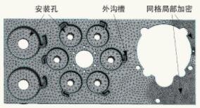 对底板进行冲压件的改进设计,发条弹簧安装孔进行压延拉伸处理,使得安装孔的强度得到加强。安装发条弹簧的外沟槽采用盲槽结构,以加强这部分区域的强度。安装电机的外围采用通孔结构,与电机的外围形状相配合,由于该局部尺寸较小,均为薄壁件,为提高其仿真计算结果的精度,对其进行了局部加密,改进后的仿真模型如图2 所示。
