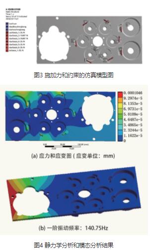 选择材料为5mm 厚304 不锈钢钢板,其弹性模量为195GPa,泊松比为0.247。图4a 为其应力和应变图,从静力学分析结果可以看出,底板的结构强度满足要求。图4b 为底板的自由模态,一阶模态振动频率为140.75Hz,局部的模态分析结果不合理,需要改进其局部结构,以提升其机械性能。
