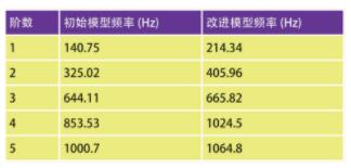 一般汽车的振动主要来源有发动机和路面两个,其中发动机激振频率与其最高转速有关,路面激振与其车速和路面状况有关。车速v 取120km/h,在较好路面的空间频率N 取5,则路面激振频率为166.67Hz。虽然路面激振经过轮胎的衰减,但其振动没有经过悬架系统的衰减,因而其频率偏安全取路面激振频率。从表1 可以看出,初始模型的一阶模态频率不能满足需要,而改进模型的一阶模态频率达到214.34Hz,满足了要求。在后续设计生产中具有借鉴意义。