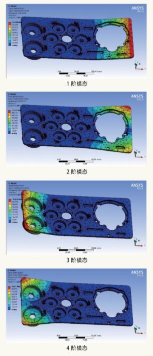 对方案二进行了模态仿真分析,在中间六个小孔处设置了X、Y 和Z 方向的约束,因而模态分析为有约束下的模态分析。模态分析结果如图6 所示。