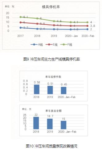 自项目2017 年启动至2019 年实施完毕以来,冲压工厂主力生产线生产停机率取得了明显下降(图9),A 线由2017 年的3.7%降低至2019 年的2%以下,伺服线E 线由2017 年的6%降低至2019 年的4%以下;伺服线由2018 年投产时的6.02%降低至2019 年的4.12%;降幅分别平均为46%,33.3%和32.1%;同时冲压件产品质量改善效果显著,零件质量不断提升,单车返修件数由2018 年的0.58 降至2020 年2 月的0.45;单车废品金额由2018 年的22元降至2020 年2 月的15 元(图10)。