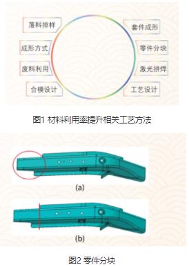 材料利用率提升可通过多种工艺方法实现,如图1 所示。本文通过分析产品工艺性,在产品设计阶段及模具工艺设计阶段,制定应用新工艺技术,提高材料利用率。
