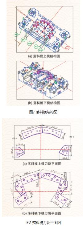 落料模具的结构图和刀块排布平面图如图7、图8 所示,通过模具刀块的作用,形成所需的板料形状。