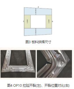 天窗安装板激光拼焊板方案及尺寸确认后,通过CAE 软件进行分析确认,此板料可以满足生产需求,制件状态满足产品设计性能要求。将相关数据发给激光拼焊厂家进行确认,厂家可以满足此方案生产,并提供30 台份激光拼焊板调试板料进行生产验证。激光拼焊板板材到货后安排压机进行调试,调试时OP10 拉延内侧四个角产生开裂,原因为内侧四个角焊接后为直角,在拉延走料过程中撕裂,此四处开裂消除不掉,通过现场调试可以将开裂部位控制在废料区内,如图4 所示。
