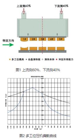 这样的冲压特点,导致压机承受很大的偏载负荷(图2)。常规多工位压机的设计如果要克服这种大偏载则只能降低冲压吨位使用,从而导致压机吨位“名不副实”,能力利用率低。