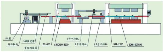 整线工作顺序为:①S2-800 前端三合一开卷整平后送料→800t 压机冲压,完成级进模生产,或落料生产→皮带机输出产品;②S4T-1200 右侧三合一送片料→1200t 压机首序落料并继续多工位生产→皮带机输出产品。