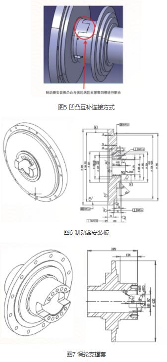根据制动器安装板与涡轮支撑套的连接方式的分析与研究,确定该连接方式是导致该类问题的根本原因,原有连接方式是两个端面用螺栓和紧固销简单的连接,由于每次微动调整时,瞬时扭矩和振动较大,该扭矩和振动直接传递到螺栓和销上,加上两连接零件之间存在的安装间隙,造成螺栓和紧固销需要承受较大的扭矩和振动的冲击,所以,需在连接结构方面进行改进,降低瞬时扭矩和振动对螺栓和销的冲击,需使用一种全新的连接结构,使得维修方便,维修成本较低,凹凸互补连接方式就可以很好的解决该问题。