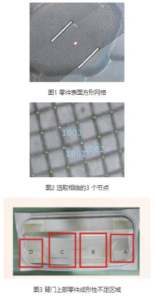 在汽车覆盖件冲压前,将板料表面印制上方形网格。经过冲压成形后,获得有方形网格的完整零件,如图1 所示。利用四镜头的数码相机拍摄照片,然后系统自动对拍摄得到的四张图像进行分析计算,获得空间相机的坐标位置,建立每张照片之间的空间关联,从而获得每个零件表面方形网格节点的空间坐标值,相临的3 个节点可以计算该位置的局部应变,如图2所示,由此可以得到整个零件范围内的应变分布。利用所采集到的数据能完成成形过程优化、数字仿真板料成形等系列分析。