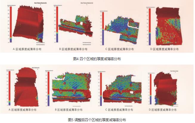 比较图5 和图4 中A、B、C、D 四个成形不足区域厚度减薄率分布,可以发现零件表面成形性不足的区域明显减少,说明数字化网格分析不仅可直接反映测量区域应变分布和厚度减薄率,而且能有效指导覆盖件冲压成形工艺的改进。