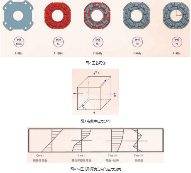 ⑴材料模型。由于厚板零件的成形,其弯曲半径与板厚之比一般都比较小,弯曲部位的应力状态为三向应力状态,如图3 所示。所以在选取材料模型时,需要考虑材料的厚向异性。在Dynaform 中的36#、37#、39#材料模型比较适合厚板类的冲压成形分析。在材料截面单元方程和积分点的选取上,根据图4 中各类工艺工况下厚度方向的应力分布特点,如果只是单纯的分析成形工序,可选用2#单元方程BT 壳单元,5 个积分点。但如果后续还需要分析回弹等工序,必须选用16#单元方程全积分单元,7 个积分点。因为2#单元方程计算速度快,是16#单元方程的5 倍。但16#单元方程能够捕获合理的应力分布,计算结果精确,对于回弹分析尤其适合。