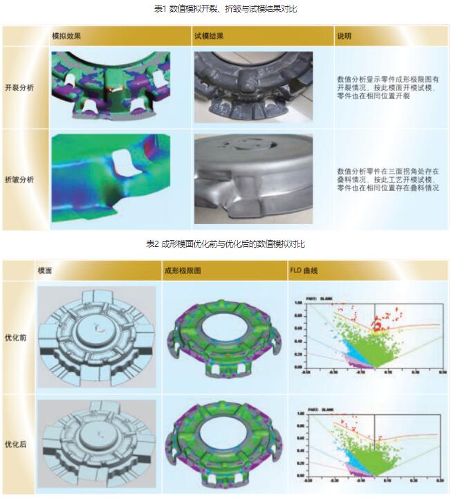 建立模型后按工艺设计要求输入工艺参数,提交运算后得到该零件的成形极限图,并结合材料的FLD曲线图,以及材料的减薄率等特征,我们可以判断该零件的加强凸台处存在很大的开裂风险,需要对成形模面进行优化。对比优化前后的成形模面与数值仿真见表2。优化模面后的数值模拟结果中,成形极限图未有破裂,FLD 曲线上只有局部边界点超越了材料的抗拉极限曲线,不影响零件的整体成形性能,可按优化后的模面作为成形模具。