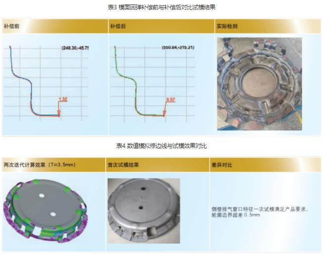 按工程使用经验,用首次计算的坯料线为计算基础,经三维软件简化后再次提交仿真软件计算,逐步提高计算的误差精度,更容易计算出逼近开模尺寸的坯料线。因为如果首次计算的精度误差设置的太小,可能导致运算无法收敛而报错。所以首次计算的精度误差不能设置太小,一般按一倍料厚设定,再逐步提高计算的精度误差。这种计算方法已在同类零件中得到验证,效果较好。表4 为该同类零件两次迭代计算效果对比首次试模结果。