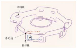 首先,需要在三维环境下将产品成形零件所需要达到的理想边界线进行三维数据的建模。并将三维模型导入Dynaform 分析软件,导入状态如图7 中“目标线”所示。