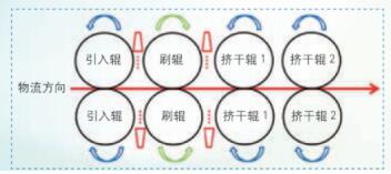 板料能够过清洗机,主要是由引入辊将料引入清洗机,刷辊上下两侧的上下喷嘴喷射清洗油冲洗板料上下表面,刷辊高速反转,共同作用将板料洗净,两组挤干辊将多余的清洗油挤出板料,并在板料表面形成油膜防锈,如图6 所示。