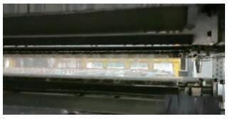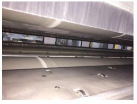 检查挤干辊的状态。此前现场生产人员反馈,清洗机里面卡进过板料,因此需要打开清洗机的上箱体检查挤干辊的表面,检查发现此清洗机的挤干辊外观正常,没有明显外伤,挤干辊2 比挤干辊1 颜色稍浅,清洗机过板料张数不足50 万片,是由于挤干辊浸油不足导致,对板料油膜薄有影响。另挤干辊2 中间有两处擦印,辊系在运行一段时间后可自动弥补,造成目前此处位置油膜稍厚,也是板料上出现部分油膜偏厚的原因,如图8 所示。