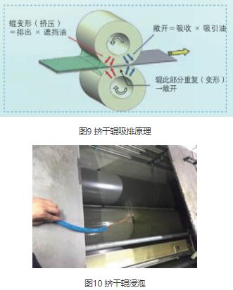 由于清洗机在开始投入使用前未按要求对挤干辊进行长达48 小时浸泡,导致挤干辊未完全浸透,并且挤干辊仍在初期使用阶段,挤干辊的吸排能力有待进一步加强,如图9 所示。拉伸长度大的板料需要更厚的油膜才能保证拉延效果,因此板料在过清洗机后需要附着更厚的油膜。