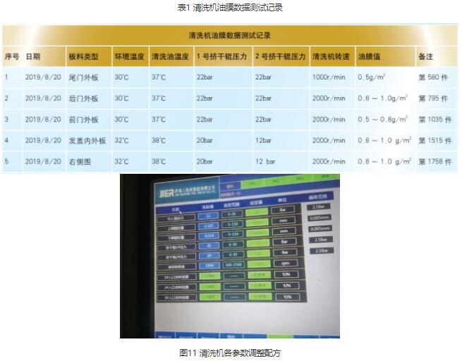生产过程中设置不同的压力观察油膜变化情况,经过油膜计的测量,符合带有挠度清洗辊线压力的变化规律,压力控制系统无故障。询问生产情况得知,需要油多的板件均为深拉延的内板件,主要是前门内板和后门内板,而外板在当前清洗机参数的设置下进行生产,零件未出现质量问题,生产人员提出诉求,可以在生产前门内板和后门内板时在线调整油膜薄厚。