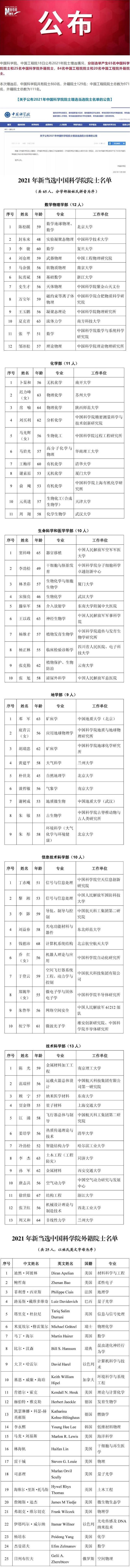 中国科学院、中国工程院18日公布2021年院士增选情况,分别选举产生65名中国科学院院士和25名中国科学院外籍院士,84名中国工程院院士和20名中国工程院外籍院士。