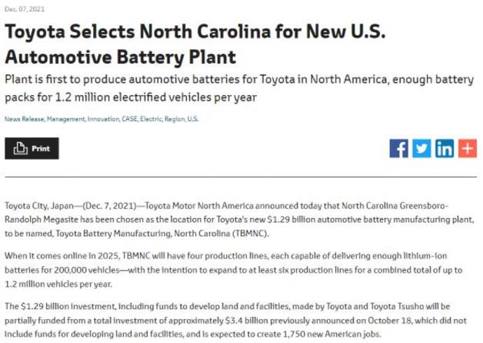 丰田官宣新电池厂落户美国北卡